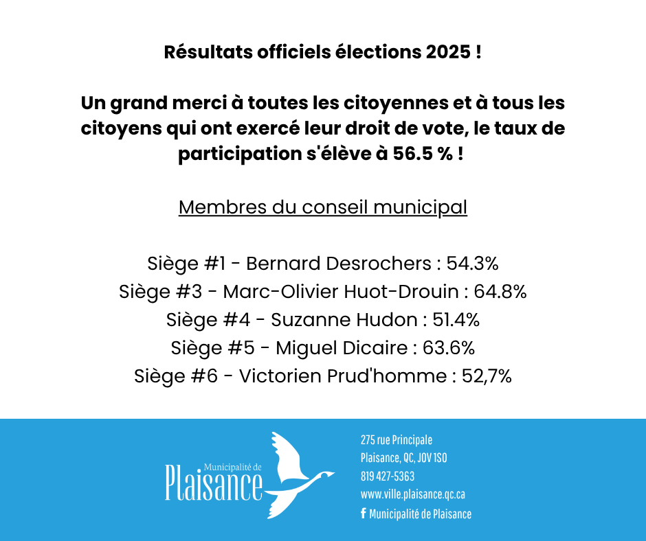Vous désirez travailler pour l’équipe du personnel électoral ? Communiquer avec Mme Anick Tourangeau, secrétaire d’élection au 819 427-5363 poste 2604 ou envoyez une demande par courriel à l’adresse suivante : dga@villeplaisance.com