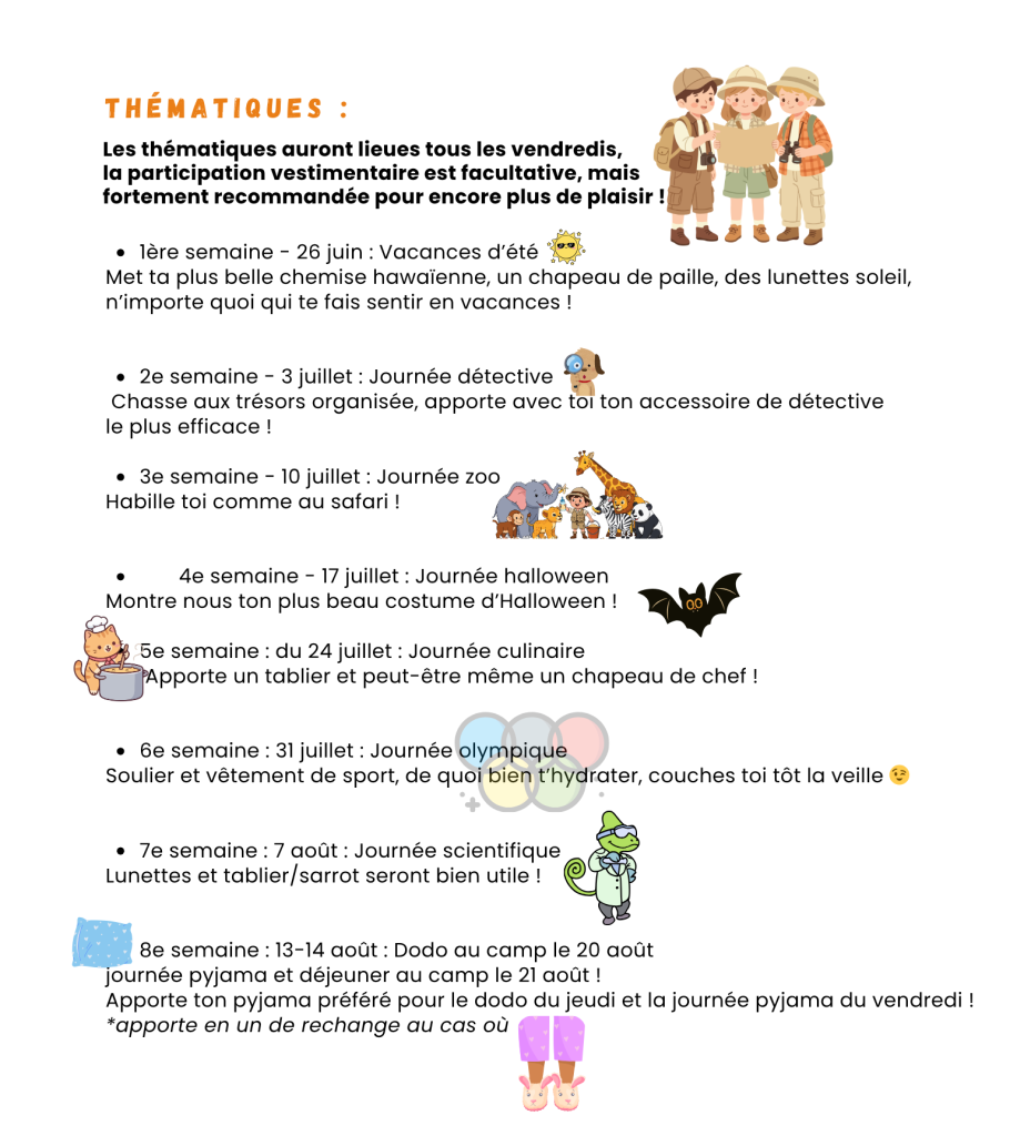 *Veuillez noter que pour les jours de sorties à la plage du Parc National de Plaisance, vous devrez déposer et récupérer votre enfant directement à cet endroit matin et soir (aire de pique-nique Desjardins, sauf exception sous avis). **Si votre enfant éprouve des difficultés à nager, il est obligatoire d’apporter une veste de flottaison, qu’il devra porter en tout temps durant la journée. Pour chaque sortie, vos enfants devront apporter un lunch froid. Veuillez également prévoir la tenue et le matériel adéquats selon les sorties et les activités prévues.