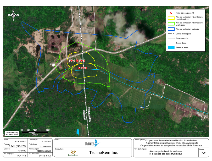Le rapport de forage et le plan de construction du puits 14/75 sont tirés de l’étude hydrogéologique de la Compagnie internationale des Eaux (1975). Le puits 14/75 est un puits tubulaire de 15 cm (6’’) de diamètre muni d’une crépine. La stratigraphie consiste en 0,3 m de terre végétale en surface, 2,4 m d’argile, 26,9 m de blocaux, gravier et sable. Le puits a une profondeur de 29,6 m, soit la profondeur du roc. La crépine a une longueur estimée de 3,4 mètres et serait située entre 26,2 et 29,6 m de profondeur. Le puits est à usage permanent. Les informations concernant la construction du puits 1/85 proviennent du rapport hydrogéologique de Roch Fréchette & Fils Inc. (1985).. Le puits 1/85 est un puits tubulaire de 20 cm (8’’) de diamètre muni d’une crépine. La stratigraphie est sensiblement la même qu’au puits 14/75, le puits se trouvant à 3,5 m du puits 14/75. Le puits a une profondeur de 29,0 m. La crépine a une longueur de 4,6 m et se trouverait entre 24,4 et 29,0 m de profondeur. Les caractéristiques des puits et des pompes sont résumées au tableau 2-1.